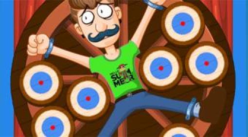 Throw knives at the spinning wheel, hit the targets and try not to hit the tied guy.