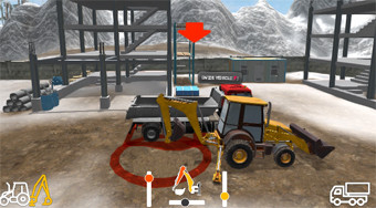Drive the truck to the marked location and then take control of the excavator. Use the excavator to load the truck with the required amount of construction material and then drive it to the construction site.